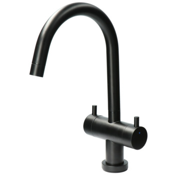 De adrian keukenkraan heeft een draaibare uitloop van 360 waarmee je eenvoudig plaats maakt bij je gootsteen. De ronde u vormgegeven kraan in mat zwarte afwerking met stevige draaiknoppen geeft een robuuste uitstraling in je badkamer.